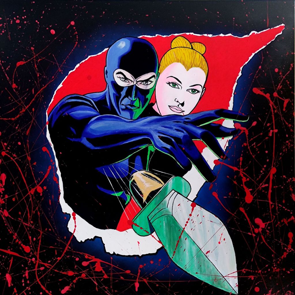 Dipinto acrilico e spray su Tela. Della serie dedicata ai fumetti, omaggio a Diabolik. Dimensioni: 80 x 80 x 4.5 cm